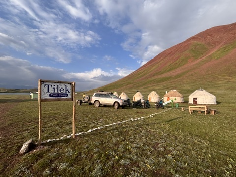 Kami berhenti untuk makan siang di Sary-Tash. Sary-Tash adalah sebuah desa kecil di persimpangan jalur tiga negara, yaitu arah Selatan menuju Pegunungan Pamir di wilayah Tajikistan, arah Timur menuju Cina, dan sebelah utara adalah Osh, kota yang telah kami tinggalkan. Lokasinya berada di ketinggian 3100 m. Udara dingin dan hembusan angin menyambut kedatangan kami di sebuah kedai kecil yang seperti “out of nowhere” setelah perjalanan panjang tanpa menemui satu bangunanpun. Kedai terpencil ini ternyata menjadi tempat persinggahan utama bagi para pelancong dan petualang yang ternyata banyak yang mengendarai motor bahkan bersepeda.