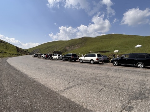 Seusai makan pagi, kami meninggalkan kota tua Osh untuk memulai perjalanan ke arah pegunungan Pamir untuk bermalam di perkemahan tradisional Yurt – Kirgisztan. Mulailah delapan mobil berkonvoi melewati jalan-jalan di lereng-lereng yang terjal dengan kelokan-kelokan yang tajam. Lagi-lagi, sepanjang rute perjalanan rasanya mata tak bisa terpejam karena sayang melewatkan suguhan alam yang menakjubkan. Setiap kali melewati spot yang “wao”, Agustinus mengajak konvoi berhenti untuk mengabadikan moment-moment mempesona itu. Ada saja pemandangan yang unik, seperti bentuk lembah yang melekuk, bentuk gunung yang sambung menyambung, atau desa-desa kecil dengan kehidupan yang sederhana di mana anak-anak kecil nampak berlarian di sekitar rumah mereka.
