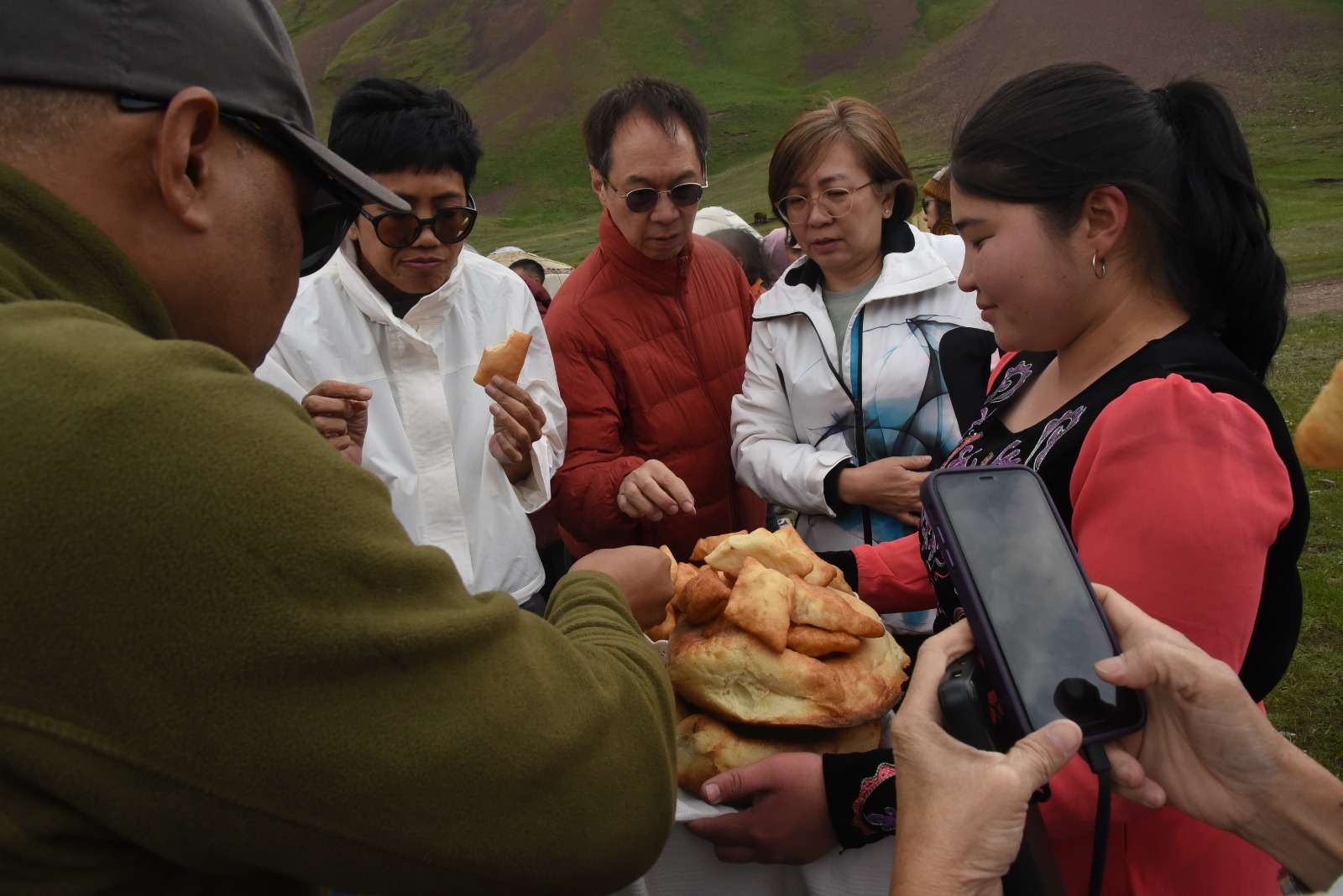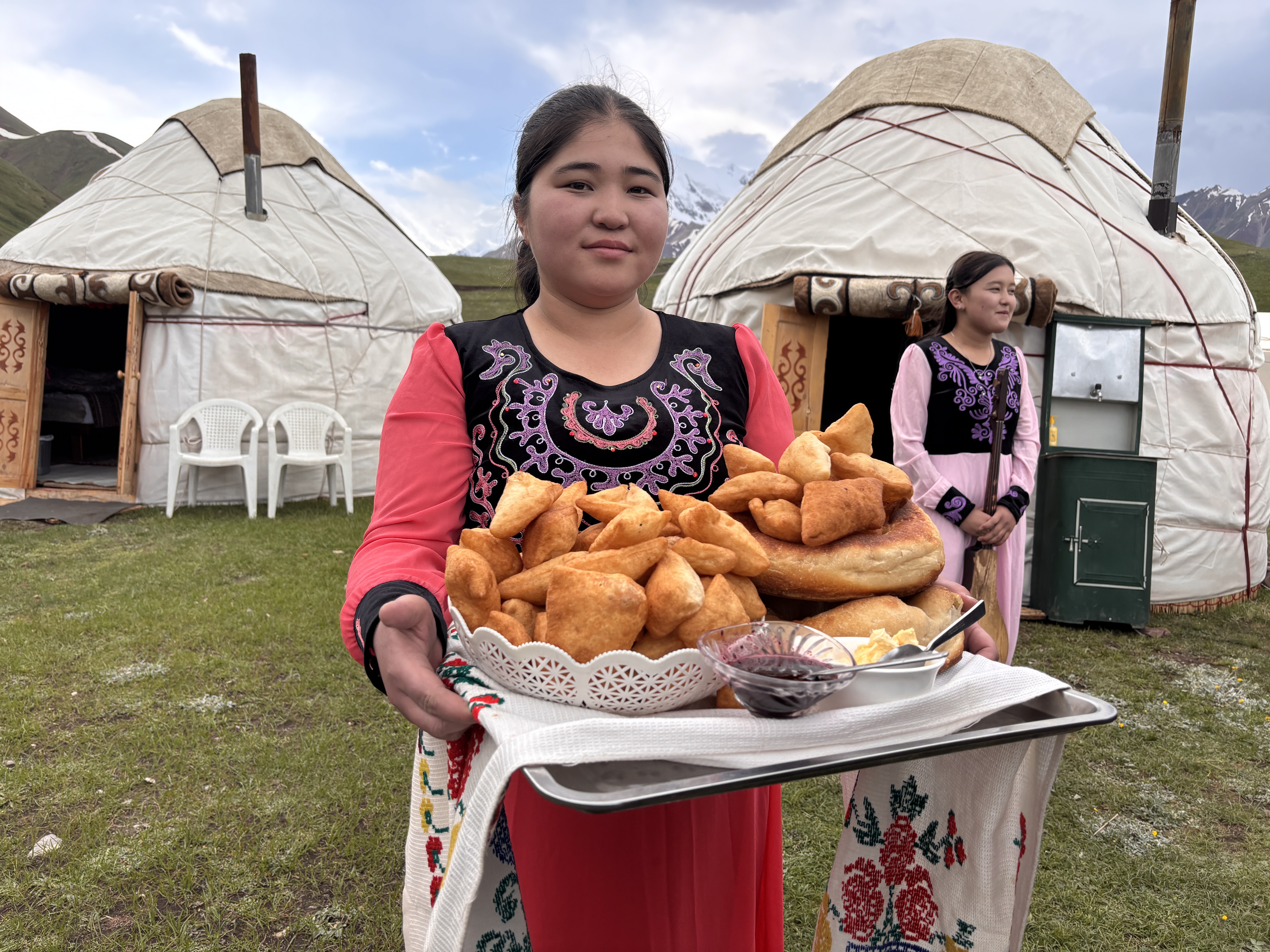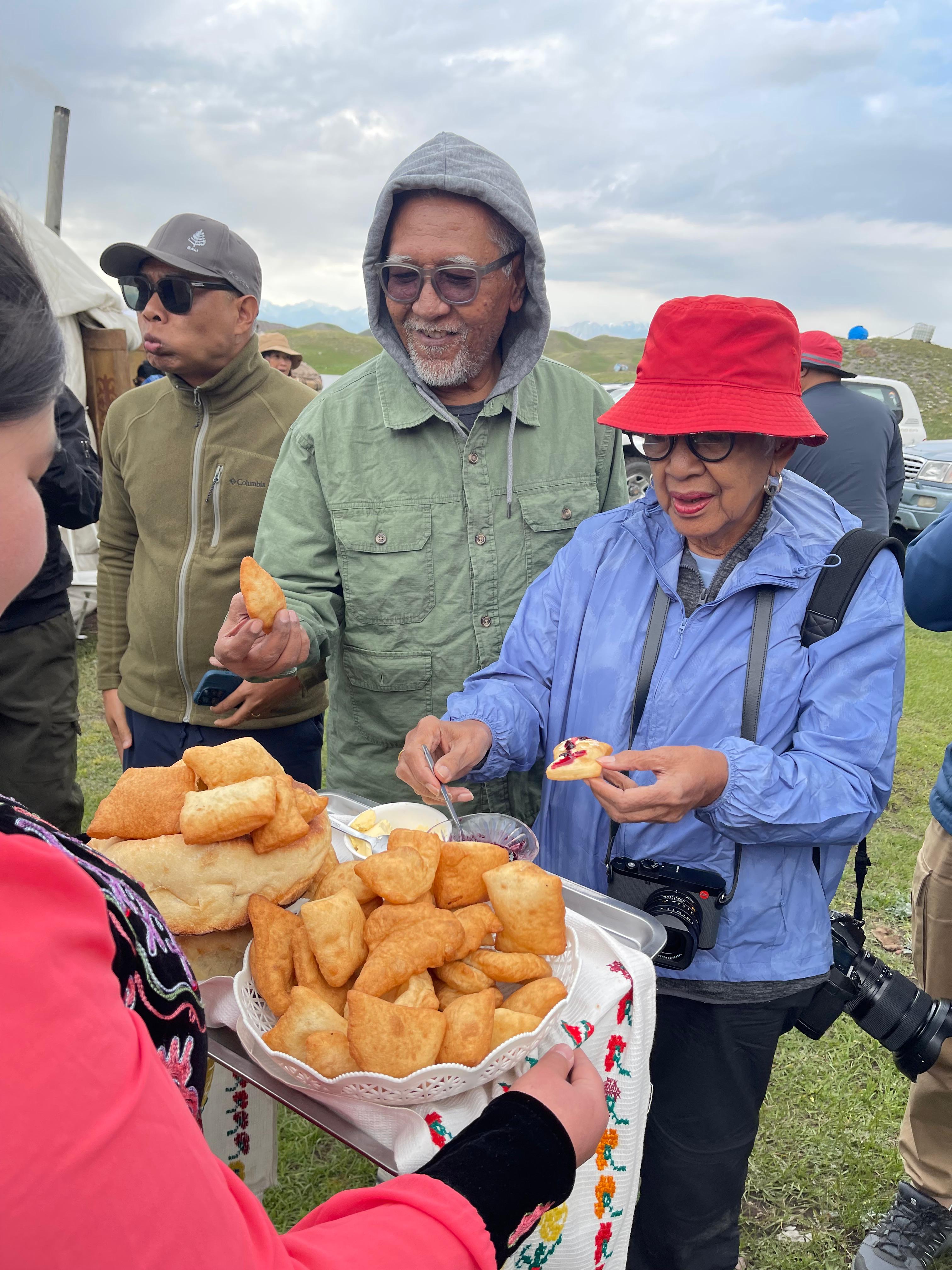Tiba-tiba alunan alat musik petik tradisional Kirgizstan (alunan Komuz) mengalun dimainkan oleh seorang pria muda ditemani seorang gadis berpakaian tradisional yang anggun menyanyikan lagu-lagu lama Kirgiz. Melodinya menggugah dan menggoda kami untuk menari-nari dalam alunannya. Momen yang sungguh tak terlupakan. Sambil menyanyi dan menari kami disuguhi roti tradisional yang mirip kue odading asal Bandung, kata salah satu rekanku, namun mirip roti goreng di kampungku, itu kataku. Ha! Apalah ya, yang penting enak dan hangat.