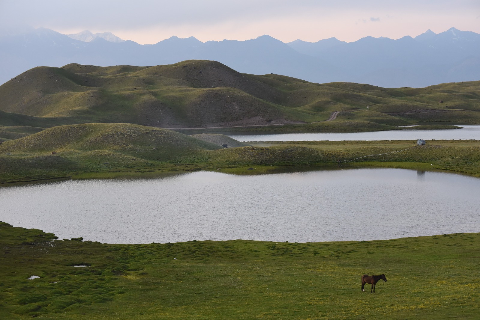 Dikelilingi oleh padang rumput alpine yang luas dan liar, Danau Tulpar-Kul menyajikan lanskap yang tak hanya memanjakan mata, tetapi juga menenangkan jiwa. Airnya yang bening, nyaris tak beriak seolah menjadi permukaan lain dari langit. Sebuah tempat di mana segala keruwetan dunia seakan menguap tanpa jejak. Hanya dengan duduk di tepinya, kita seakan diberi jeda dari hiruk-pikuk kehidupan. Ketika malam turun, suara angin kencang berhembus menyapu lembah, menyatu dengan lolongan anjing malam. Suasana magis, sepi tapi hidup.