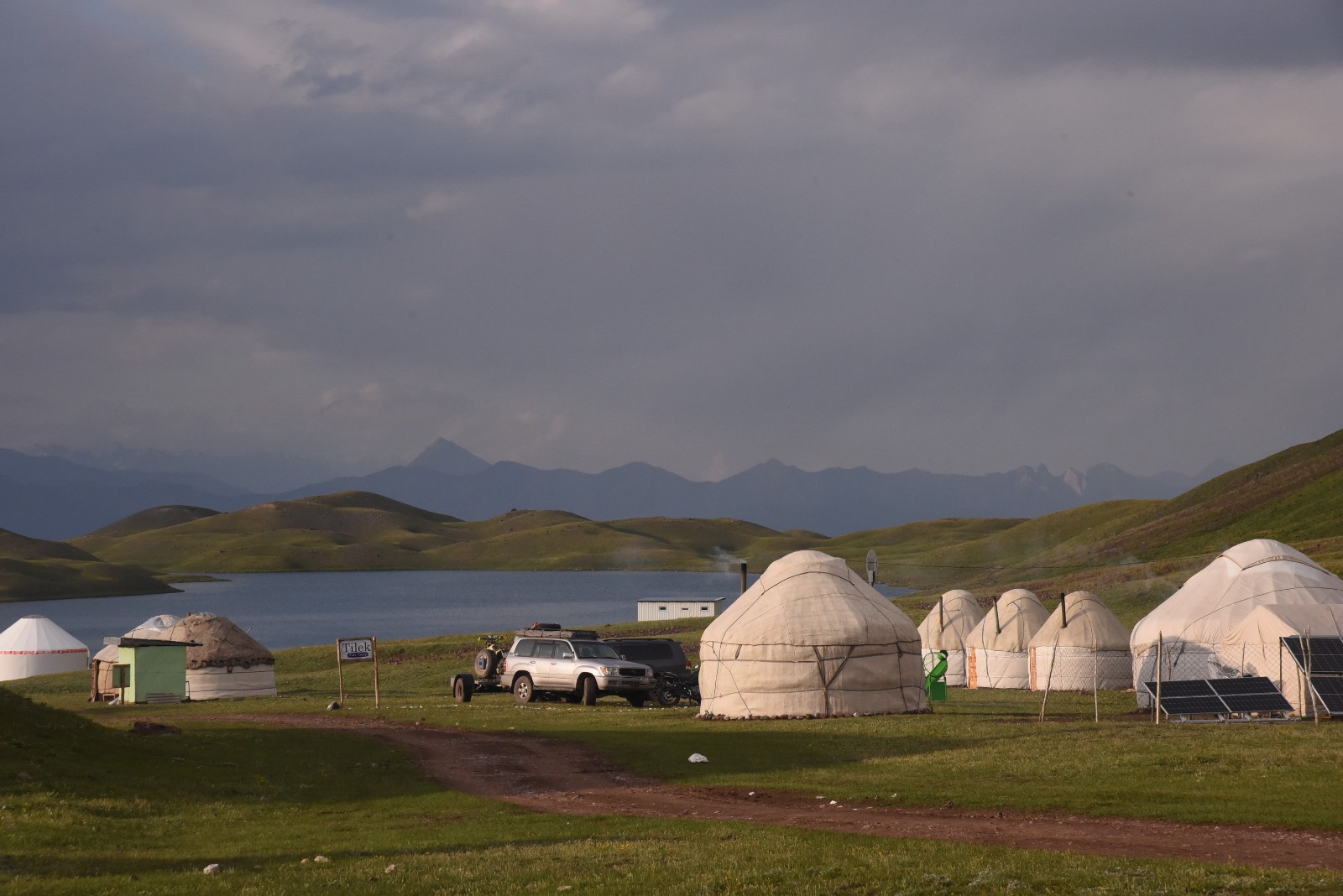 Setelah makan siang, kembali konvoi berangkat lagi. Kembali pemandangan alam menakjubkan terbentang di kiri, kanan, dan depan. Decak kagumku tak ada henti ketika melihat kubah-kubah bundar putih dengan asap mengepul membubung ke udara, yang adalah Yurt, mulai bermunculan di tengah hamparan stepa Kirgizstan yang luas membentang.